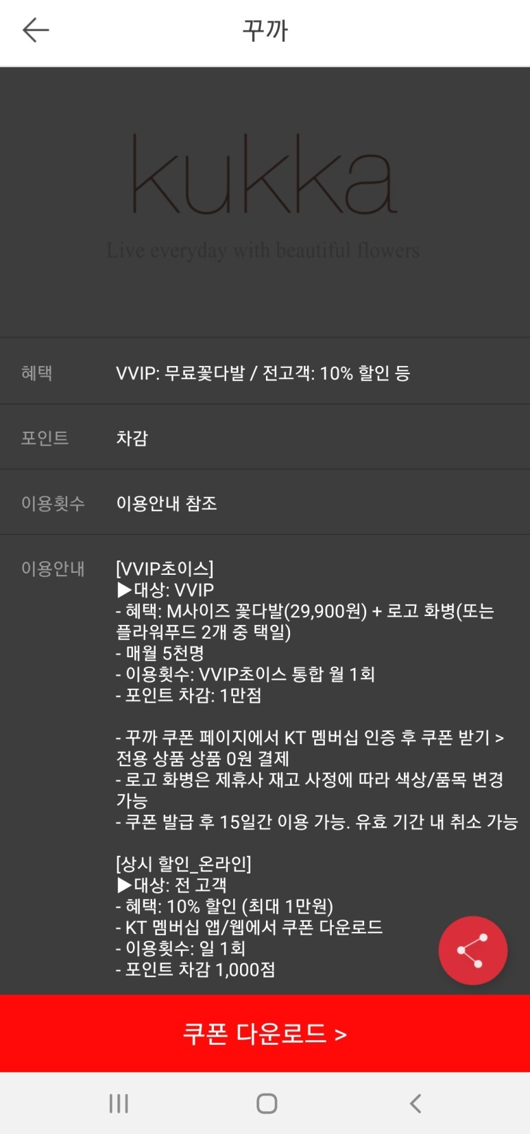그러다가 작년부터인가(?) KT VVIP 서비스에 꾸까 무료 꽃다발 서비스가 생겼다.
