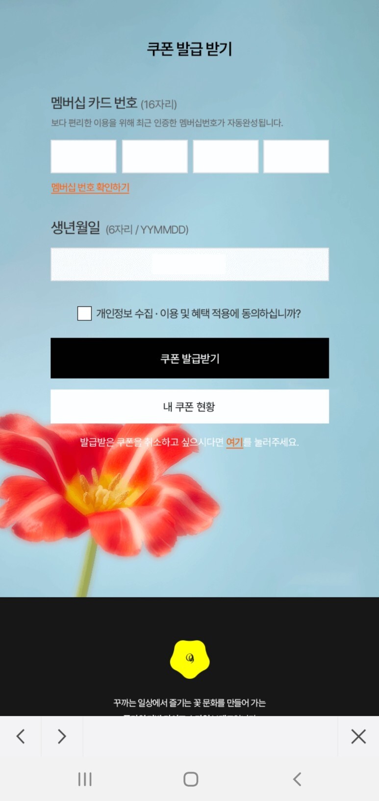 멤버십 카드번호와 생년월일을 입력하면 꽃다발 무료 쿠폰을 발급받을 수 있다.