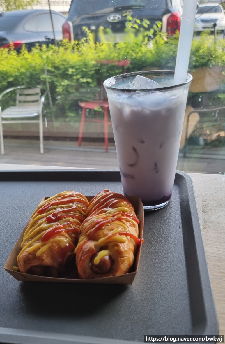 블루베리 라테랑 소시지 빵 먹었는데,